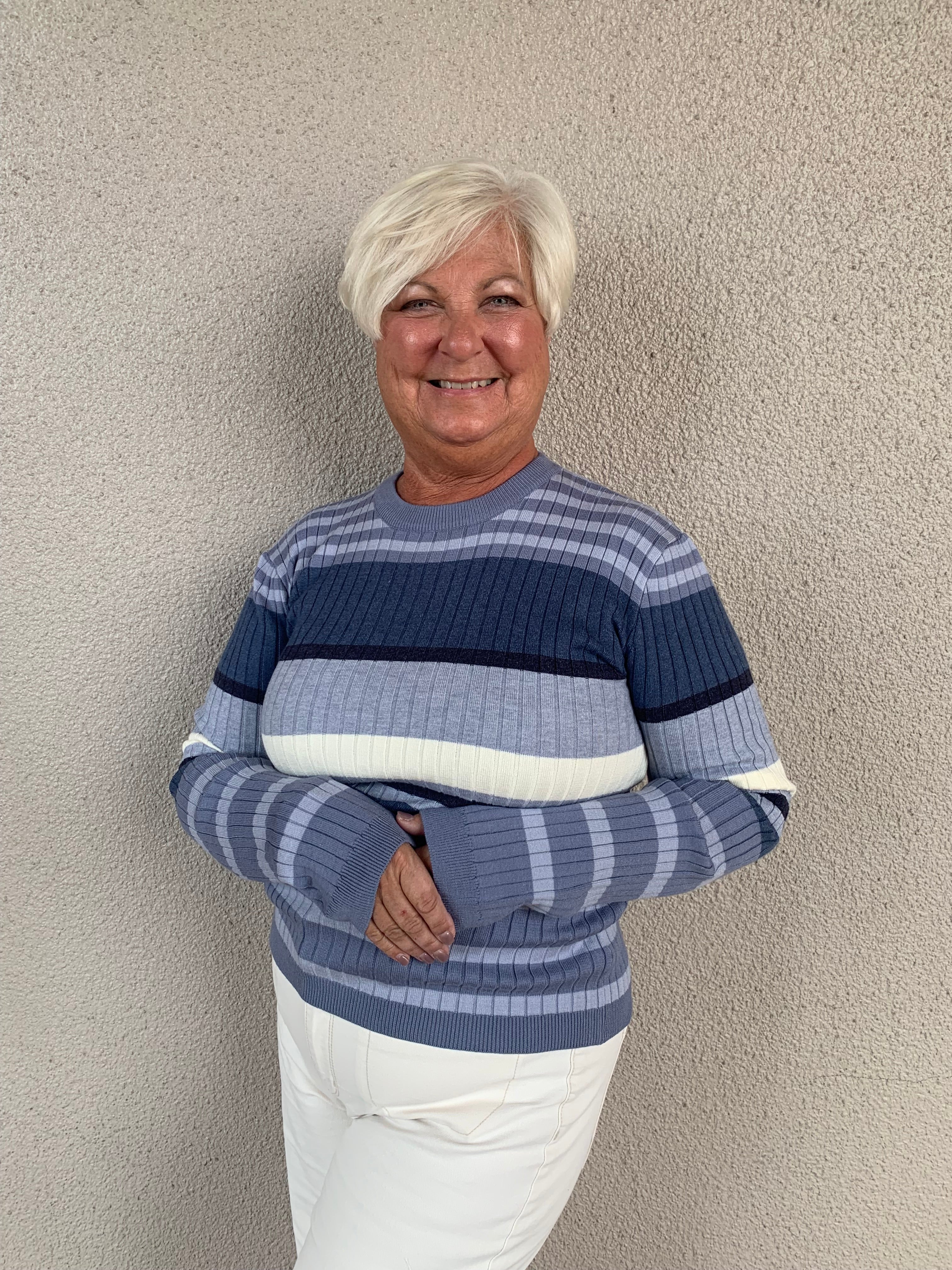 Add a pop of modern style to your wardrobe with the Color Block Striped Sweater Top in blue. Featuring a sophisticated blend of color-blocking and bold stripes, this sweater top is equal parts contemporary and cozy. The soft knit fabric offers lightweight warmth, while the relaxed fit and classic crew neckline make it effortlessly versatile. Perfect for layering or wearing solo, this piece transitions seamlessly from casual to polished looks.