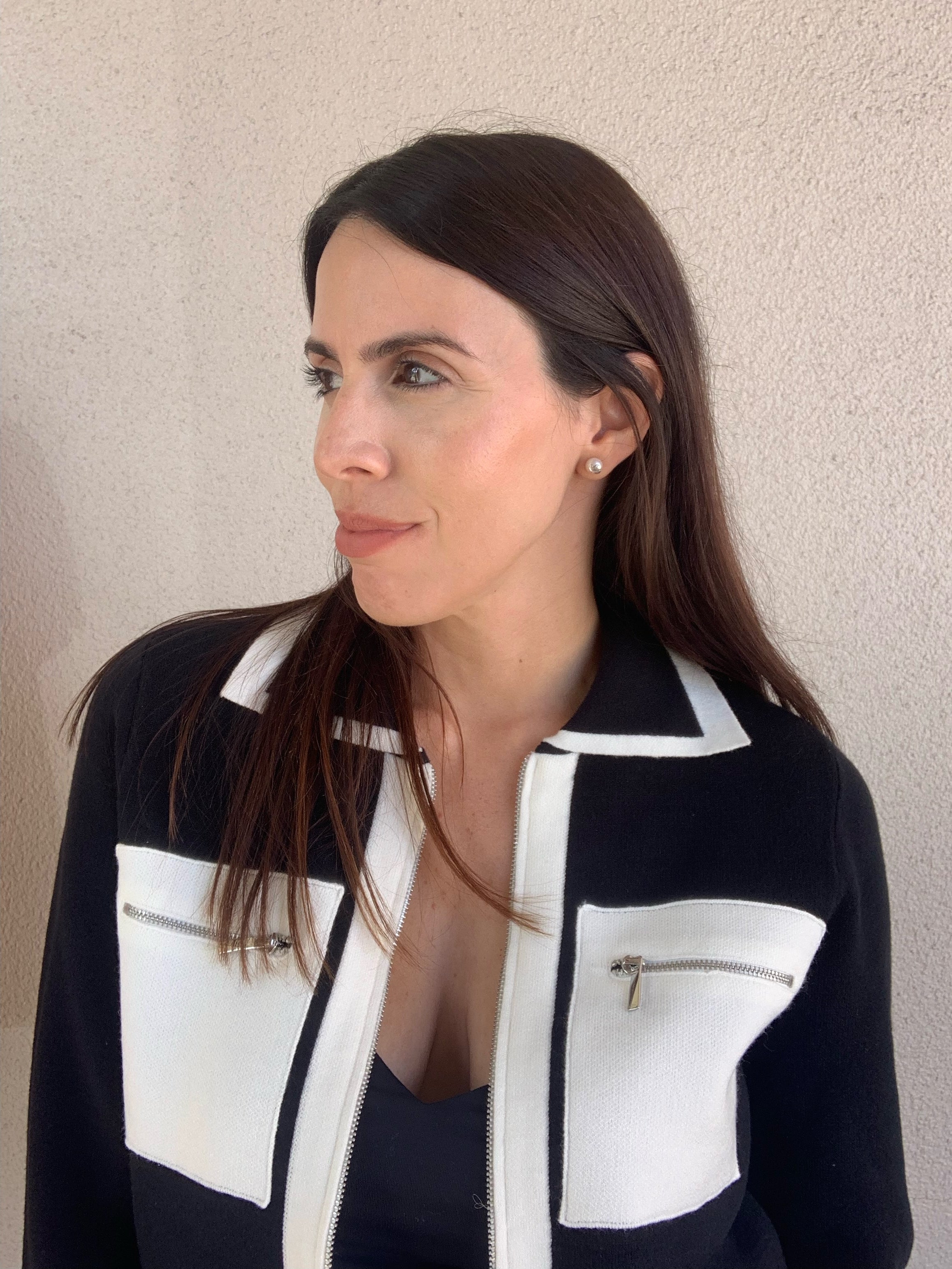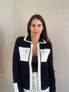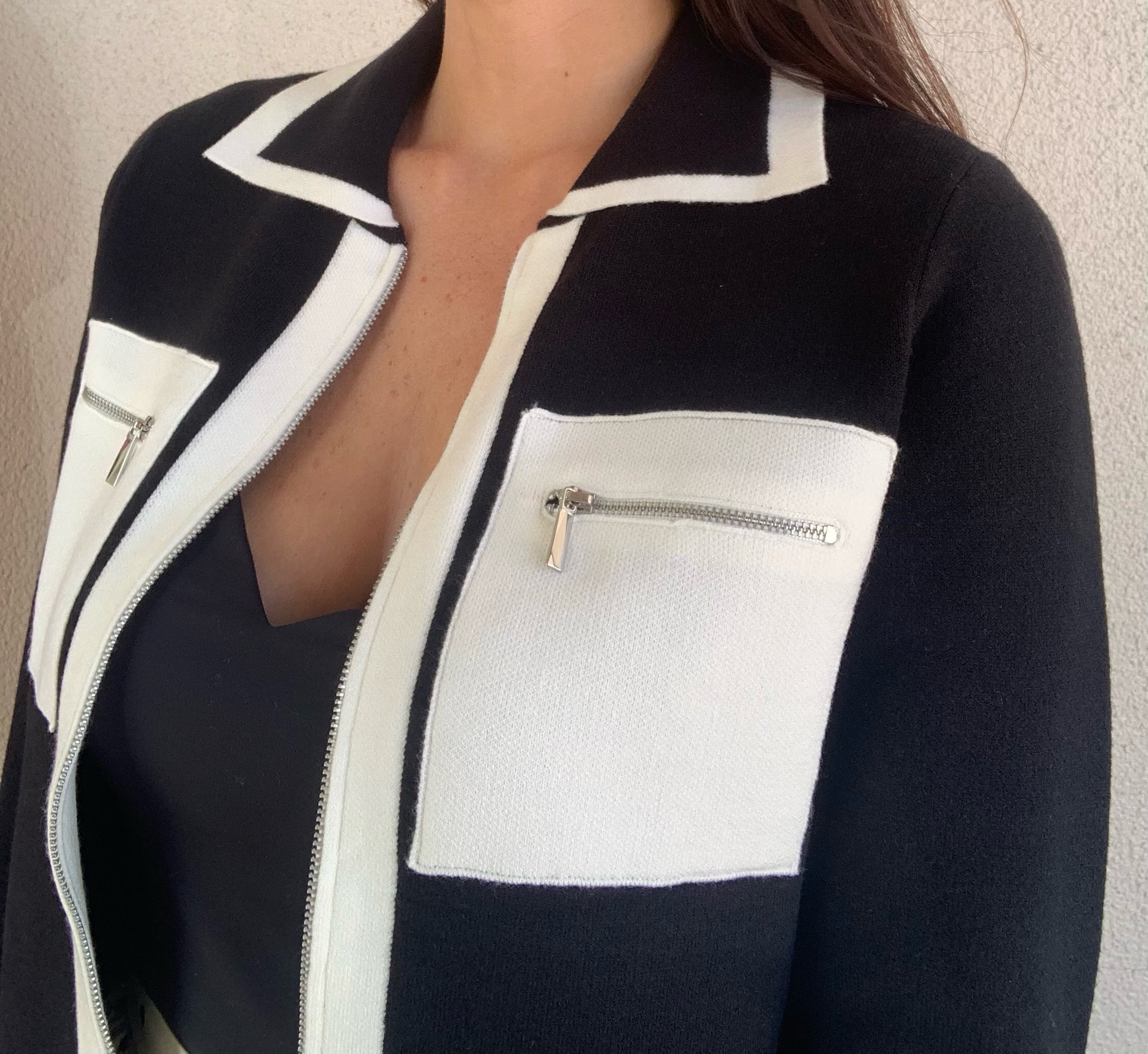Color Contrast Sweater Jacket with Patch Pocket and Zipper
