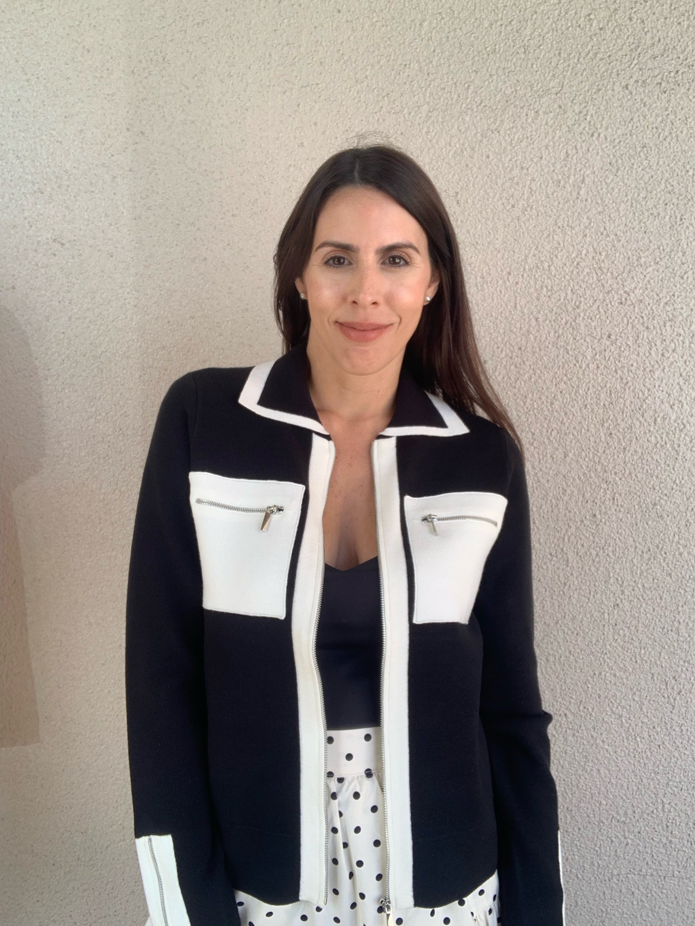 This stunning Slim-Fit Knit Jacket is the epitome of casual sophistication for your fall wardrobe. Designed with a sleek, tailored silhouette, it features a full front zipper closure and a sharp shirt collar, adding a refined touch to any outfit. The front patch pockets with zipper details and zippered cuffs enhance both style and practicality, making it a go-to piece for everyday elegance. Crafted for comfort and durability, this jacket effortlessly blends charm and functionality for a look that’s as stylish as it is versatile.Details: