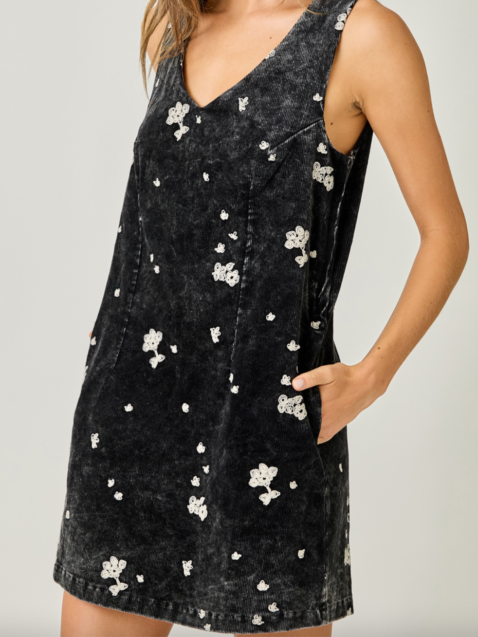 Effortless style meets everyday comfort in this charming corduroy shift dress. The soft, textured fabric drapes beautifully while the delicate embroidered details add a touch of sophistication. Practical side pockets keep your essentials within reach, and the relaxed shift silhouette flatters every figure. The subtle wash treatment gives it a lived-in, approachable feel that pairs perfectly with sneakers or boots. A versatile wardrobe essential that transitions seamlessly from casual outings to weekend gatherings.