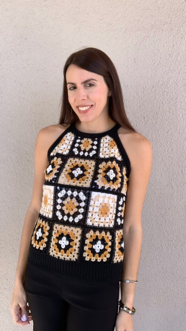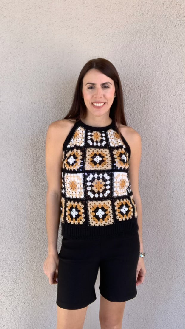 This crochet tank top is a striking blend of vintage-inspired design and modern craftsmanship. Featuring a patchwork of intricate granny square motifs in black, white, and mustard hues, it adds texture and boldness to any outfit. The sleeveless cut and high neckline make it a versatile piece, perfect for layering or wearing on its own. Lightweight and breathable, this top is ideal for creating a bohemian-chic look with denim or skirts.