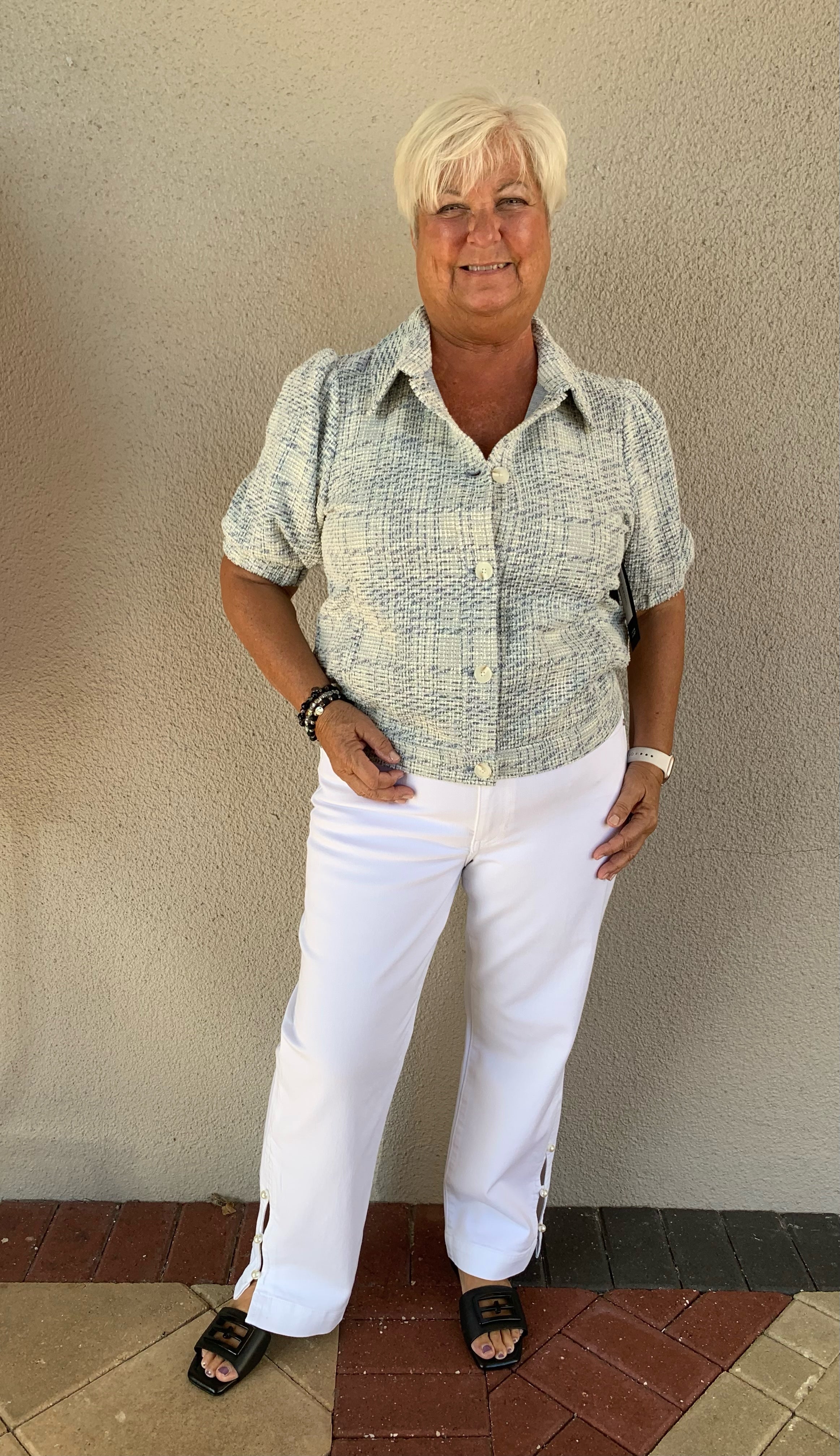 Cropped Straight Leg White Denim 27" Inseam with Pearl Trim/Cutout Detail