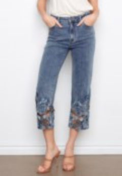 Cropped Stretch Denim Flare Leg Pant With Laser Cut Embroidery At Hem 25" Inseam