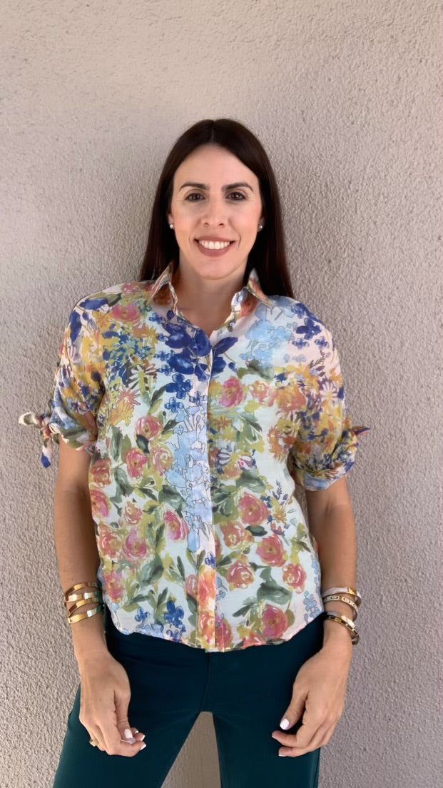 Bring a fresh bloom to your wardrobe with this Floral Print Button-Down Blouse, a perfect mix of elegance and casual charm. Adorned with a vibrant floral print, this blouse is designed to brighten your look effortlessly. The button-down front adds a polished touch, while the tie sleeves offer a customizable fit and a playful detail. With its versatile silhouette, this blouse pairs beautifully with tailored trousers for the office or relaxed denim for weekend outings.