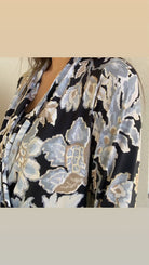 Elevate your style with the long sleeve floral surplice top, a perfect blend of femininity and modern elegance. Featuring a flattering surplice neckline, this top drapes beautifully to create a relaxed yet refined silhouette. The vibrant floral print is complemented by subtle gold metallic detailing, adding a touch of shimmer and sophistication. Crafted from a stretchy fabric, it offers all-day comfort with a chic, polished finish. Perfect for pairing with jeans, skirts, or trousers for any occasion.