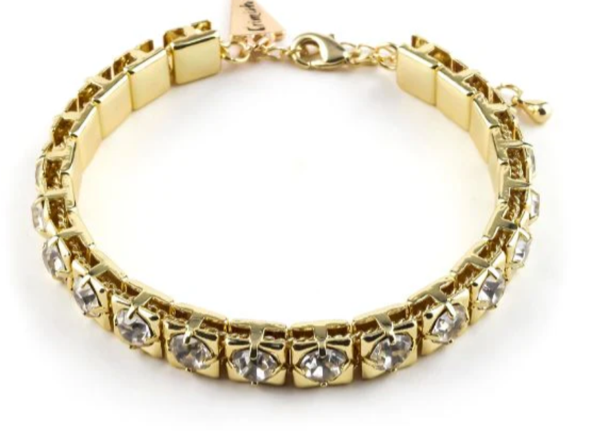 Elevate your style with the Gold Crystal Adjustable Bracelet, a dazzling accessory crafted from high-quality 14K gold-plated links. Its shimmering crystal accents catch the light beautifully, adding a touch of elegance to any outfit. The adjustable design ensures a perfect fit, making it a versatile and timeless addition to your jewelry collection.