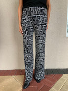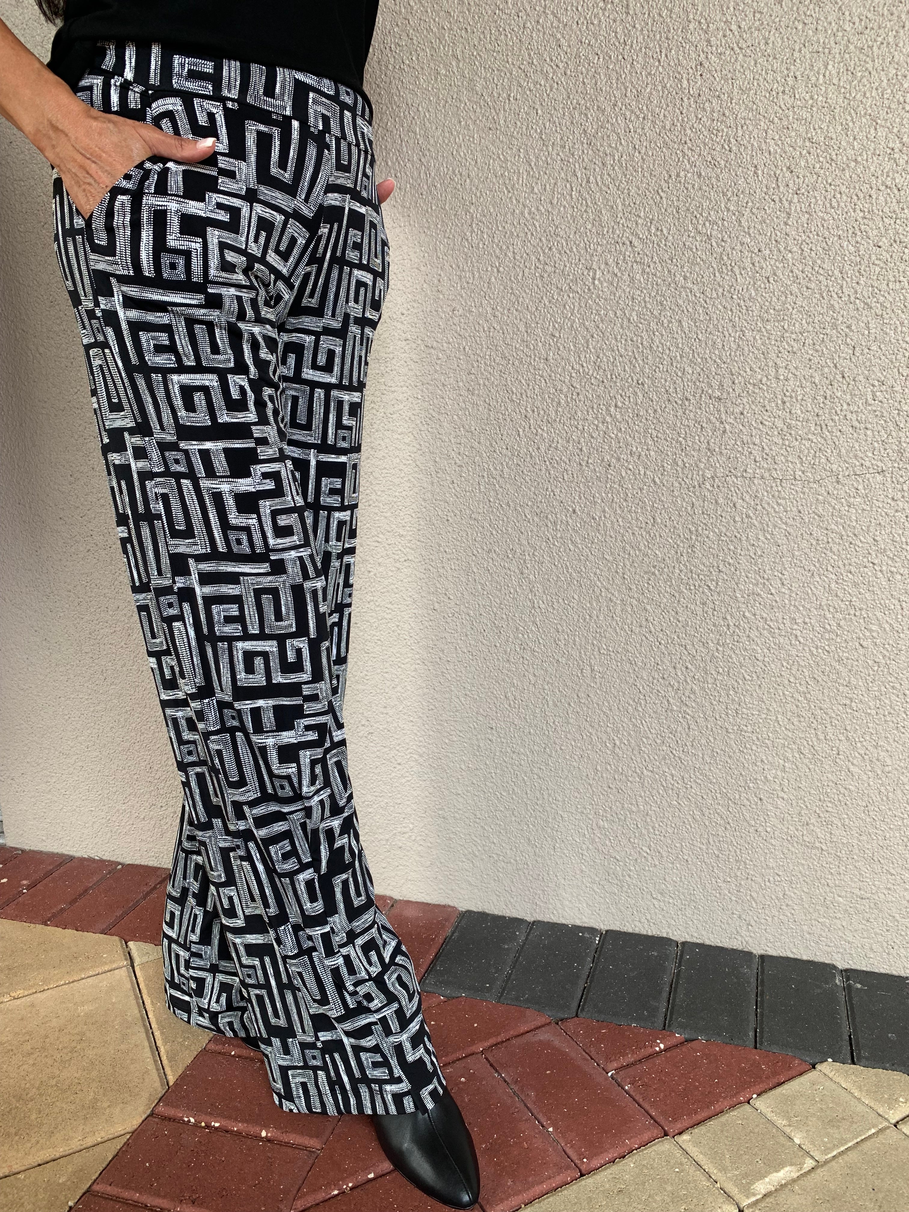 Showcasing a monochromatic black and white print, these trousers feature a bold, large-scale Greek Key patterned motif, intricately designed with textured embossed-like threading. This unique detail adds depth and creates a striking yet sophisticated finish, making them a versatile choice for both casual and dressy occasions.