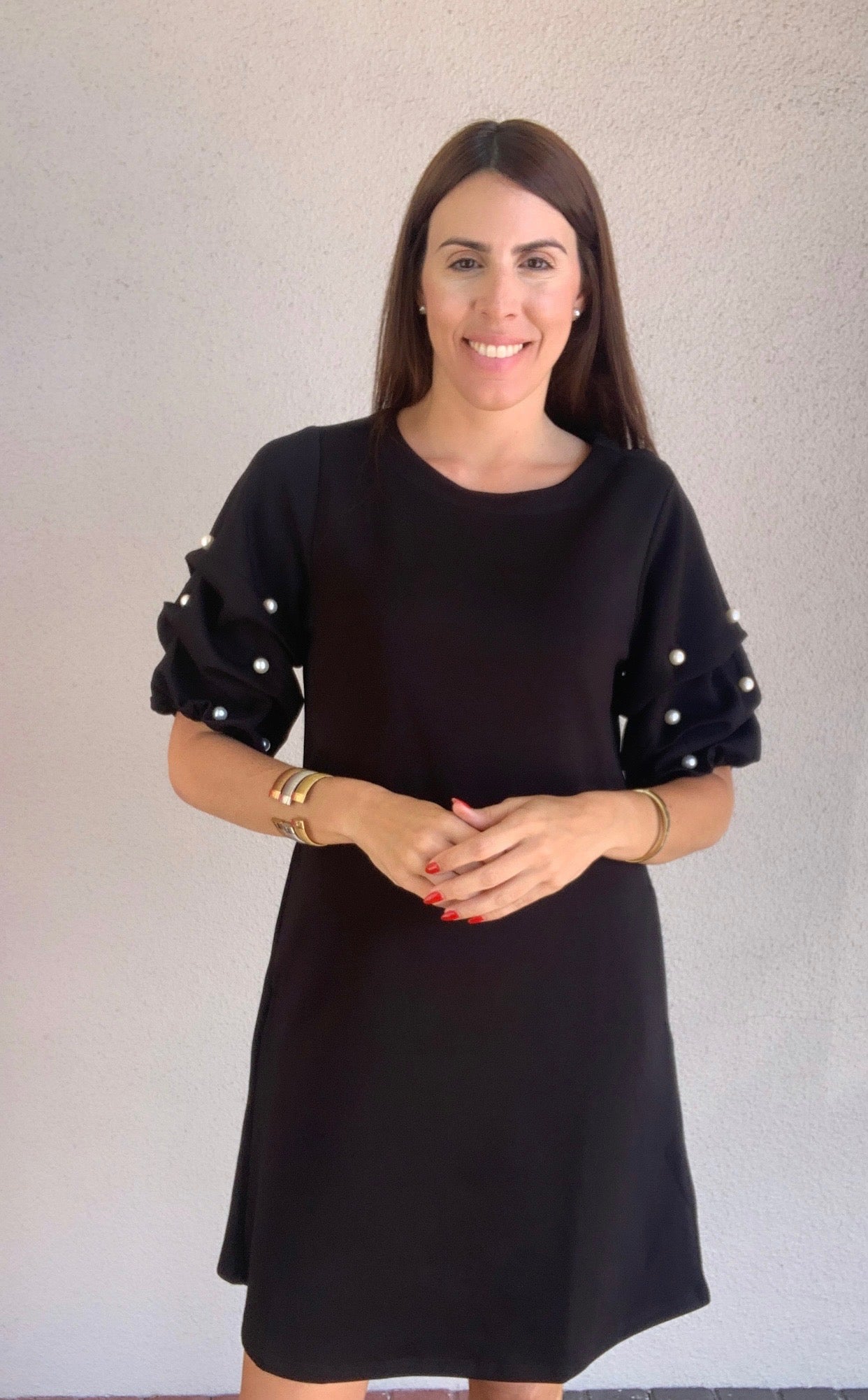 Elegant with a hint of drama, this Knit Dress with Puff Sleeves and Pearl Detail is a refined statement piece for any occasion. Crafted from a soft, stretch-infused knit, it hugs the body comfortably while maintaining its shape. The round neckline offers a classic touch, while the puff sleeves bring a graceful volume to the silhouette. Scattered pearl embellishments add a luxe finish, catching the light with every movement for an effortlessly polished look.