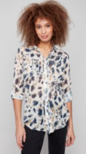 Long Sleeve Animal Print Button Front Blouse with Chest Pockets