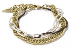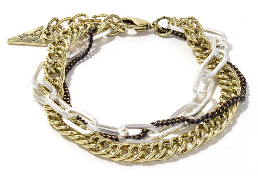 Elevate your style with the Multi Chain Mixed Metal Bracelet, featuring intricate interlocking links for a striking, layered look. Its covered snap closure ensures a secure and comfortable fit, while the toggle clasp adds a touch of classic elegance. Crafted with lead- and nickel-free 14K gold plating, this bracelet combines edgy design with timeless sophistication, making it the perfect accessory to enhance any outfit.