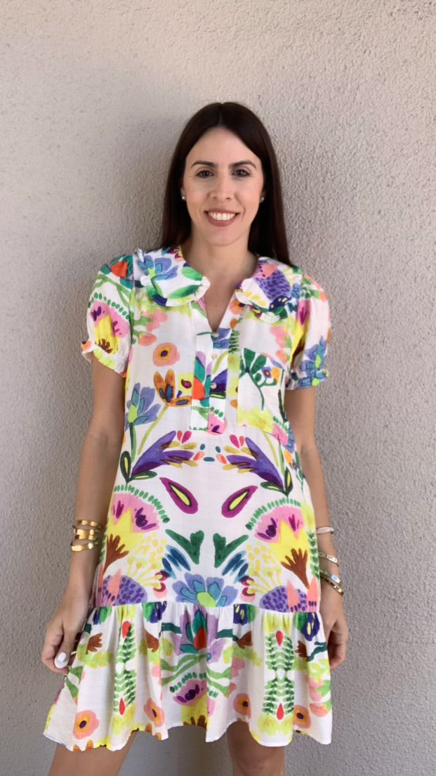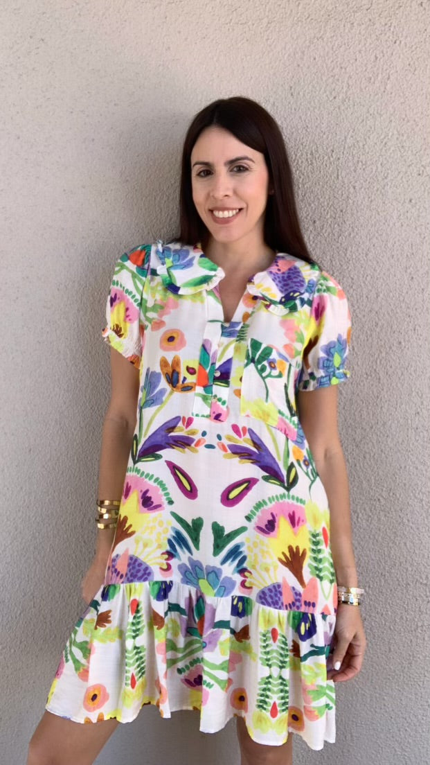 Peter Pan Collar Button Down Printed Mini Dress with Short Puff Sleeves