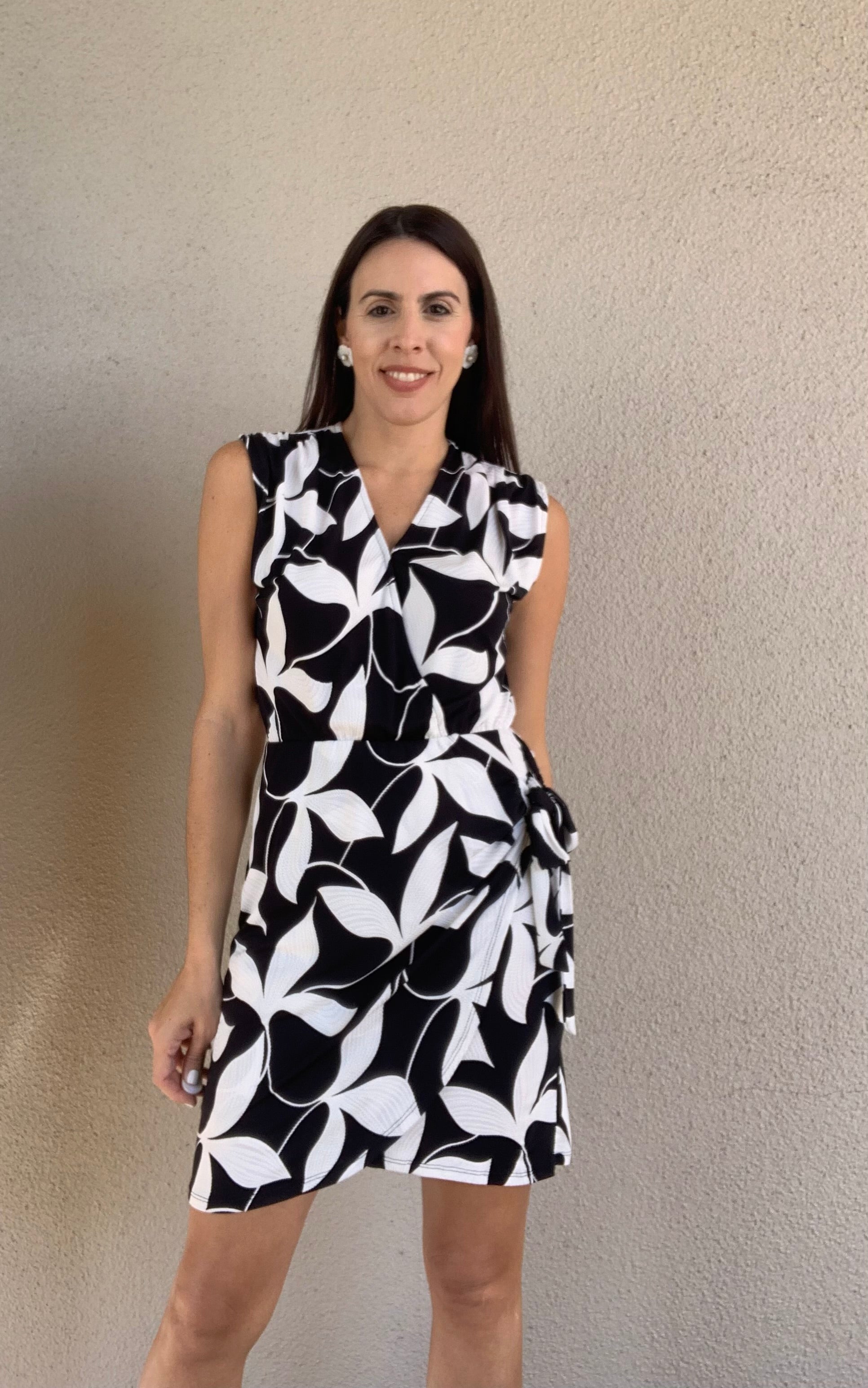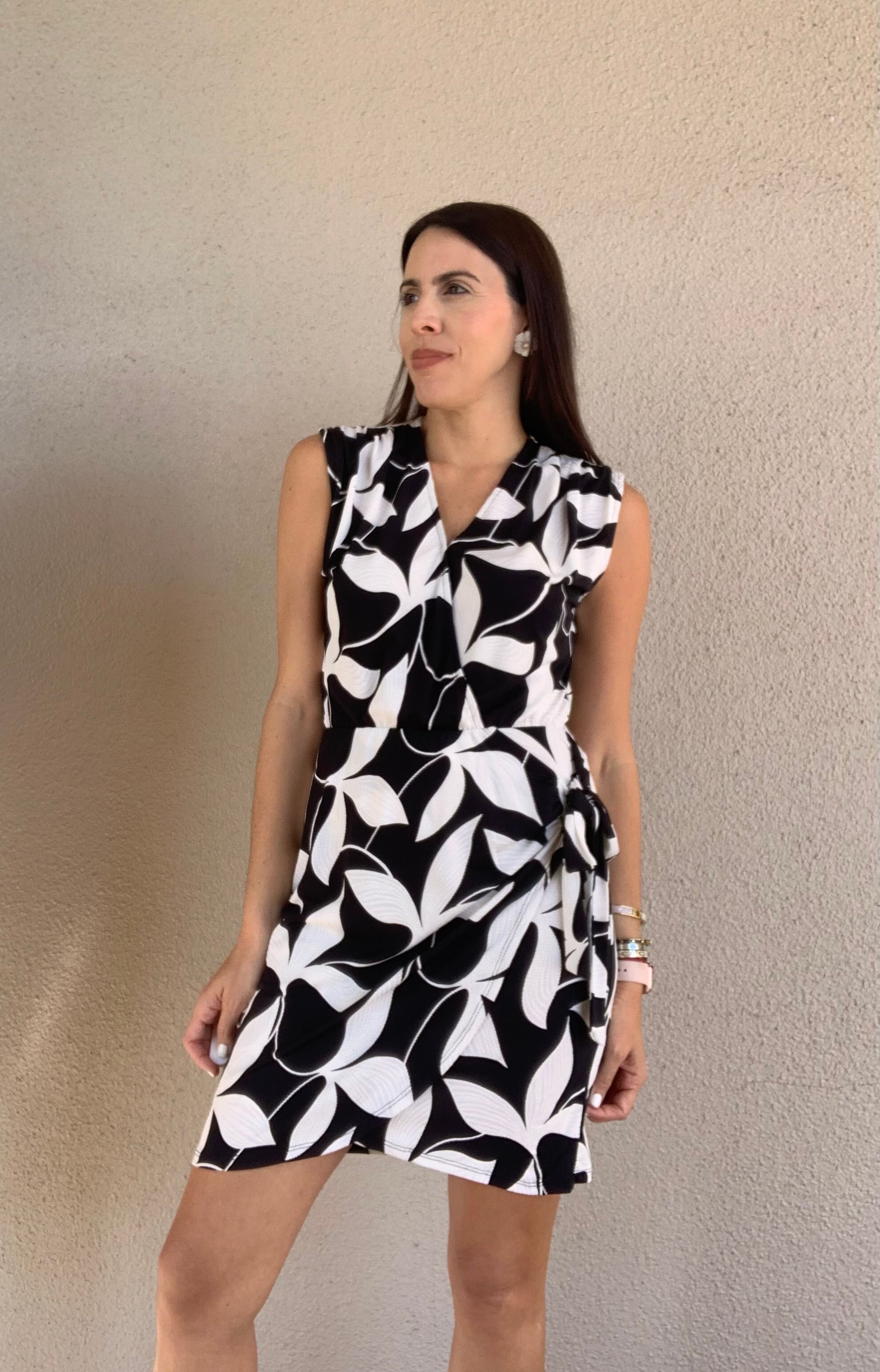 - Design: Faux wrap silhouette with a V-neckline and fitted waist