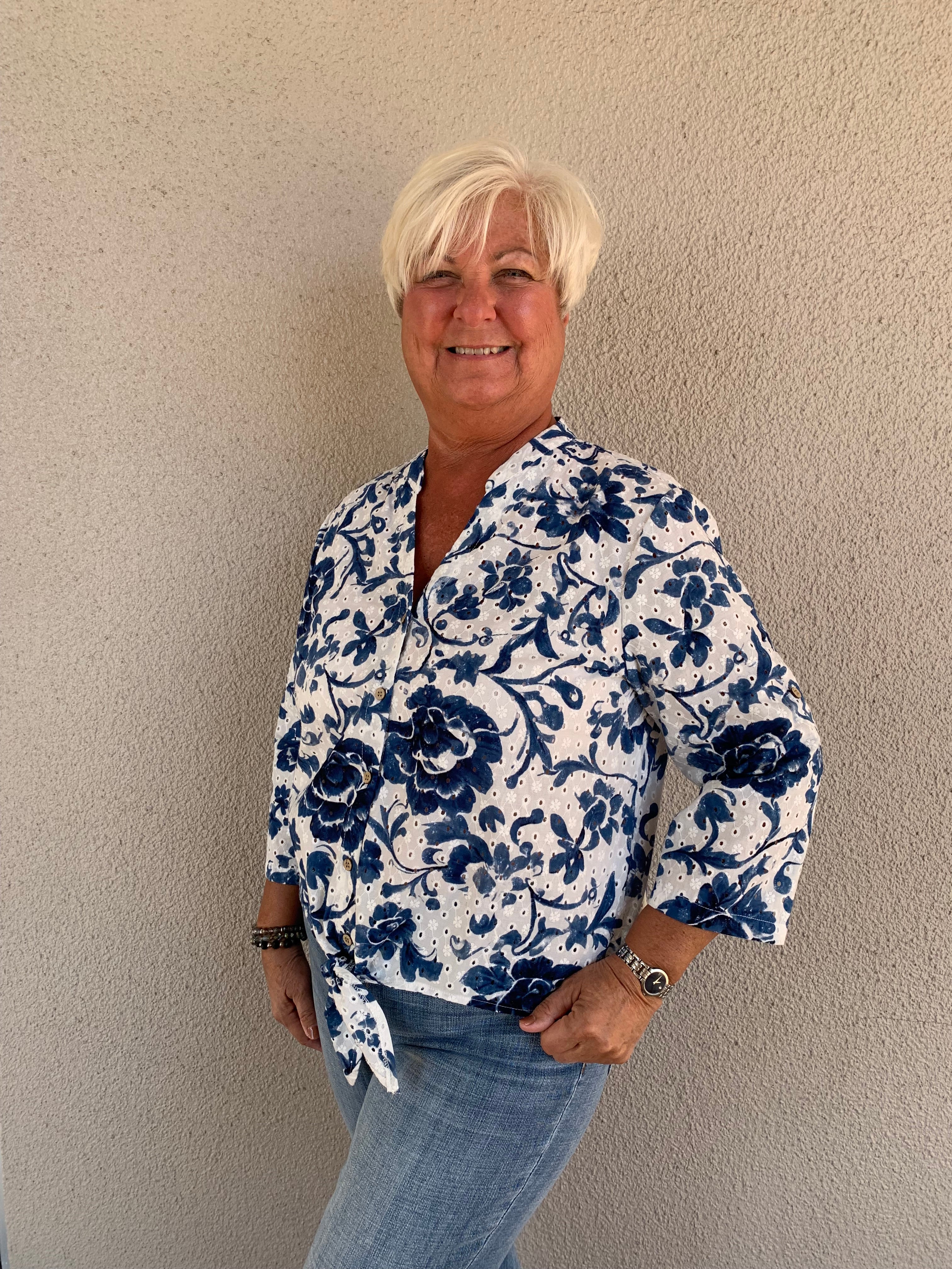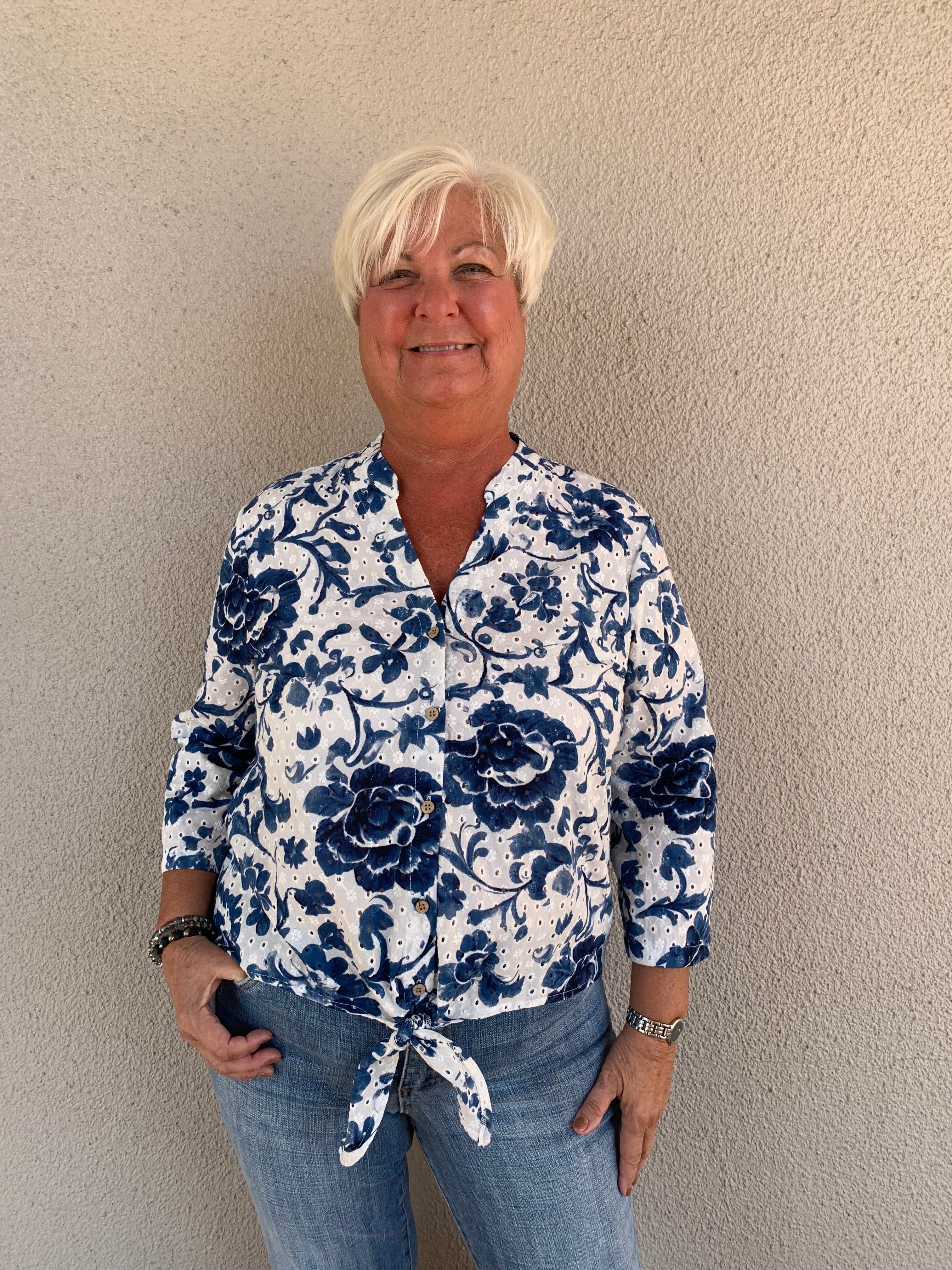 Printed Long Sleeve Eyelet Button Front Blouse with Front Tie Detail
