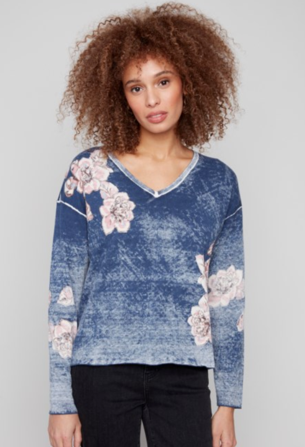 Reversible V-Neck Cotton Sweater with Floral Placement Print