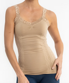Easy to wear under your low cut garments for a peak of detail, layer under your favorite blazer for the office, or simply by itself. The ruching fabric down the sides creates a slimming silhouette while adding beautiful texture.