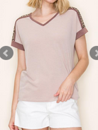 Short Sleeve Knit Tee with V-Neck & Animal Print Contrast on Sleeve