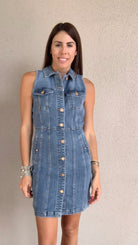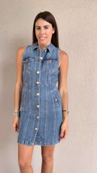 Effortlessly cool and endlessly versatile, the Sleeveless Button Front Trucker Denim Dress is a modern take on a classic utility silhouette. Featuring a structured yet flattering fit, this dress channels timeless denim jacket vibes with its button-front design, pointed collar, and chest pockets—reimagined as a sleek, sleeveless statement piece. Functional side pockets add laid-back ease, while the tailored seams give it a feminine edge.