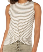 This sleeveless crew neck top features a stylish twist front with stripes and a mitered back for added interest. Perfect for any occasion, this top is versatile and on-trend. The twist front adds a unique touch, while the miter back provides a flattering fit. Stay comfortable and fashionable in this must-have top.