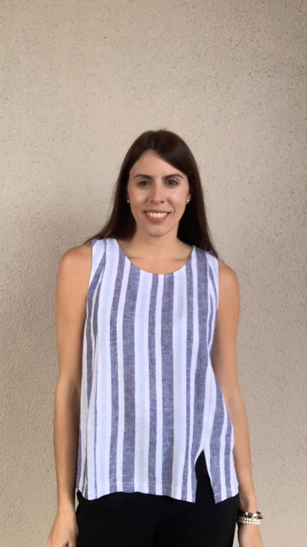 Stripe Print Sleeveless Linen Top with Slit
