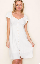 Indulge in elegant simplicity with our V-Neck Faux Button Front Dress. The flutter sleeves add a flirty touch, while the button front gives a classic touch. Perfect for any occasion, this dress will make you feel confident and stunning. Enjoy effortless style with our V-Neck Faux Button Front Dress.