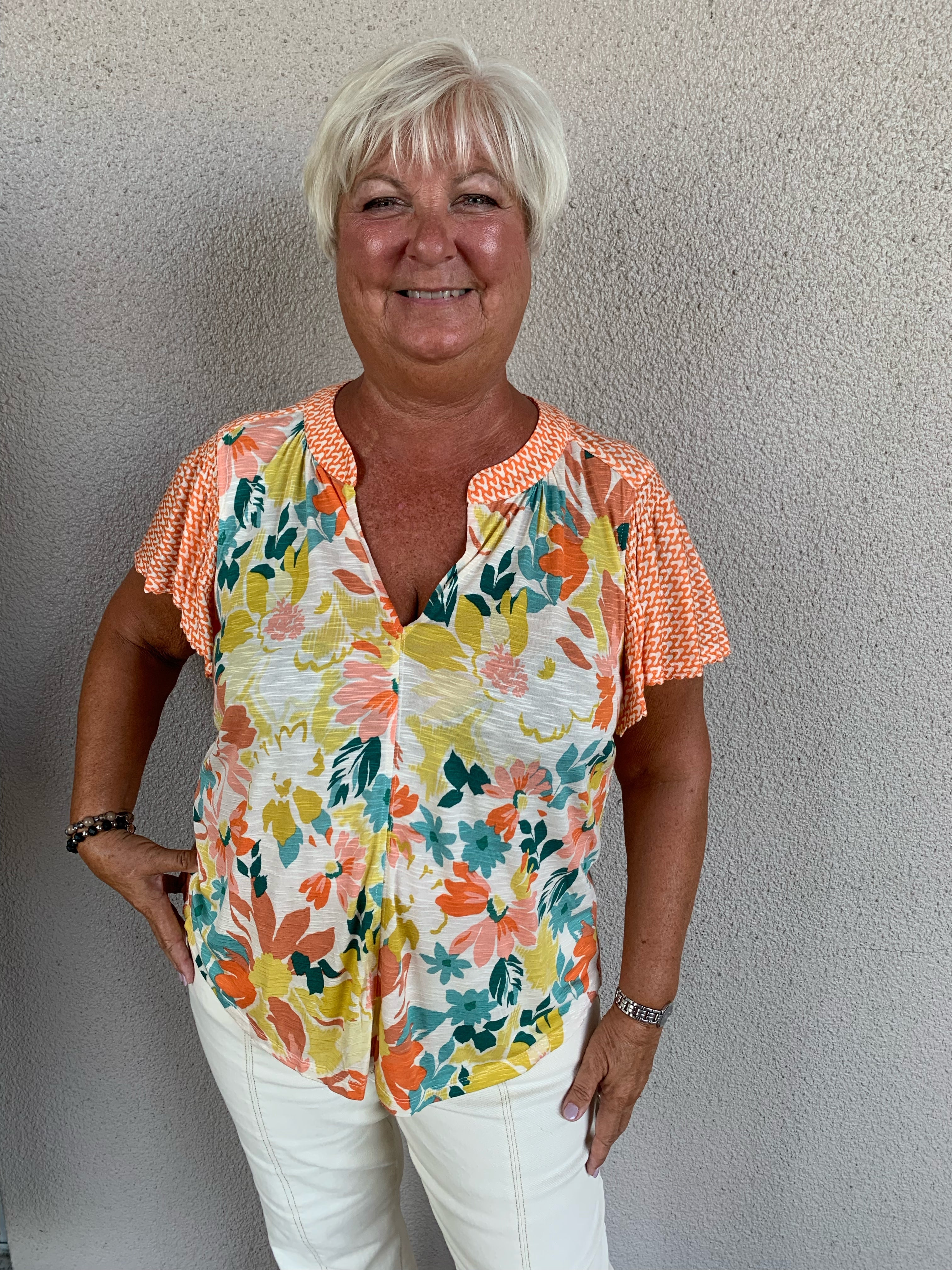 V-Neck Floral Print Top with Twin Print Short Mandarine Sleeve