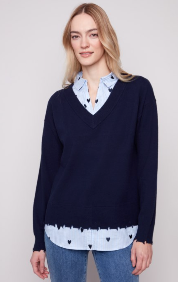 V-Neck Fooler Sweater with Heart Embroidered Poplin Shirt