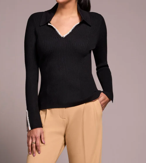 V-Neck Knit Polo Sweater with Contrast Blanket Stitch Detail