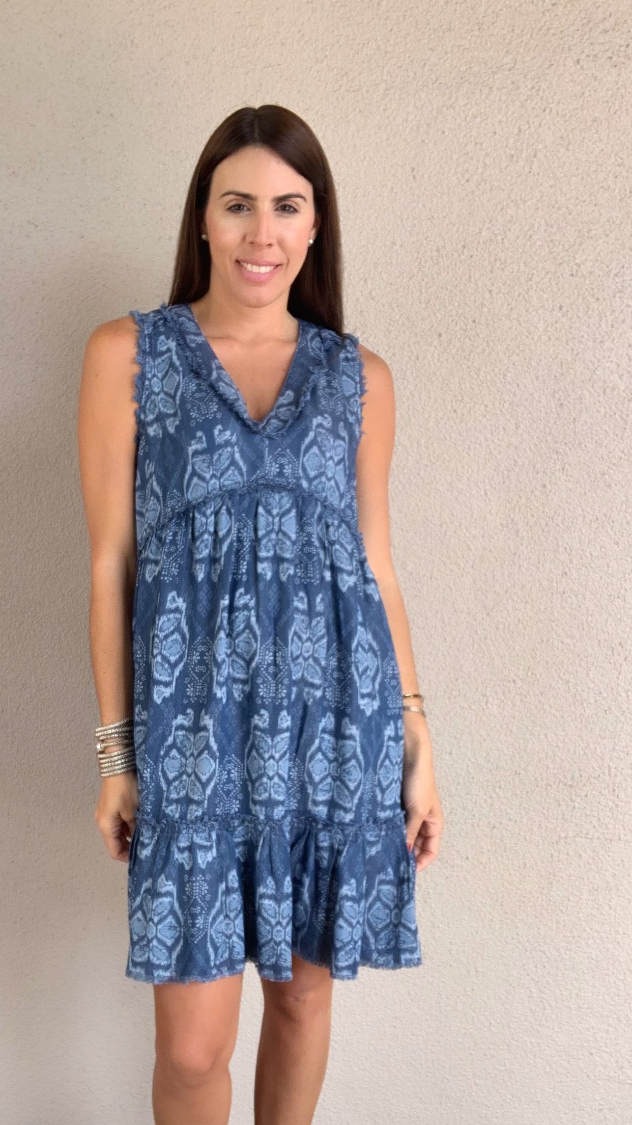 V-Neck Ruffle Tank Dress with Fray Hem & Pockets