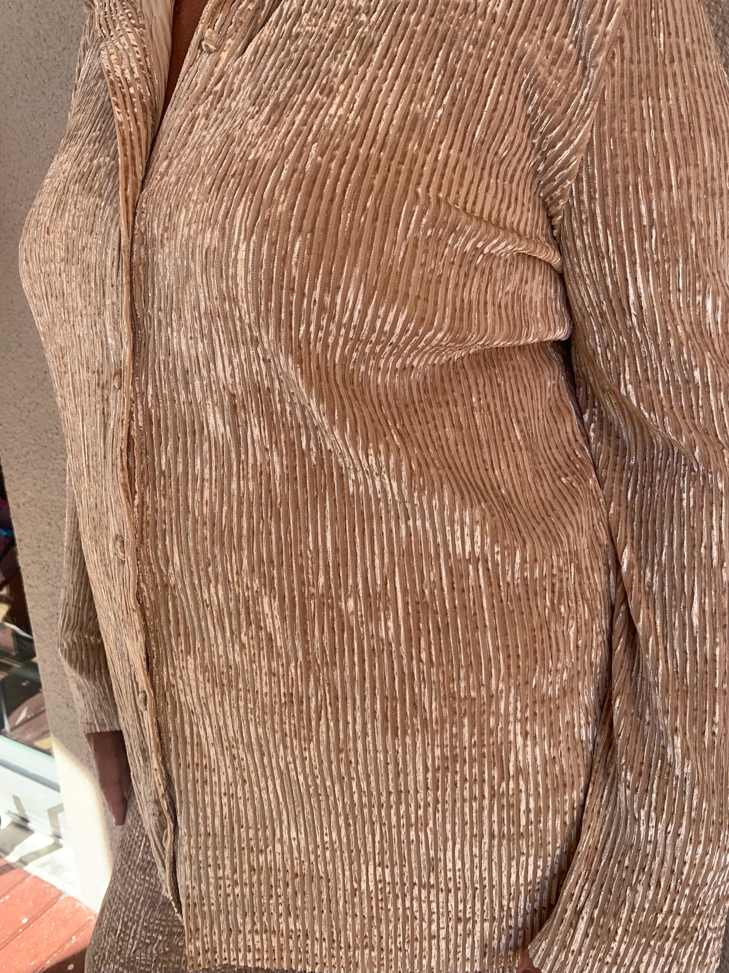Add a touch of sophistication to your wardrobe with the Velvet Collared Button-Down Shirt in a luminous champagne tone. Featuring a classic collared neckline and button-down design, this shirt offers a timeless appeal with a modern velvet twist. The luxurious fabric adds elegance, making it perfect for both casual chic and formal looks. Pair it with the matching Velvet Straight Leg Pant (sold separately) for a coordinated ensemble that exudes glamour.