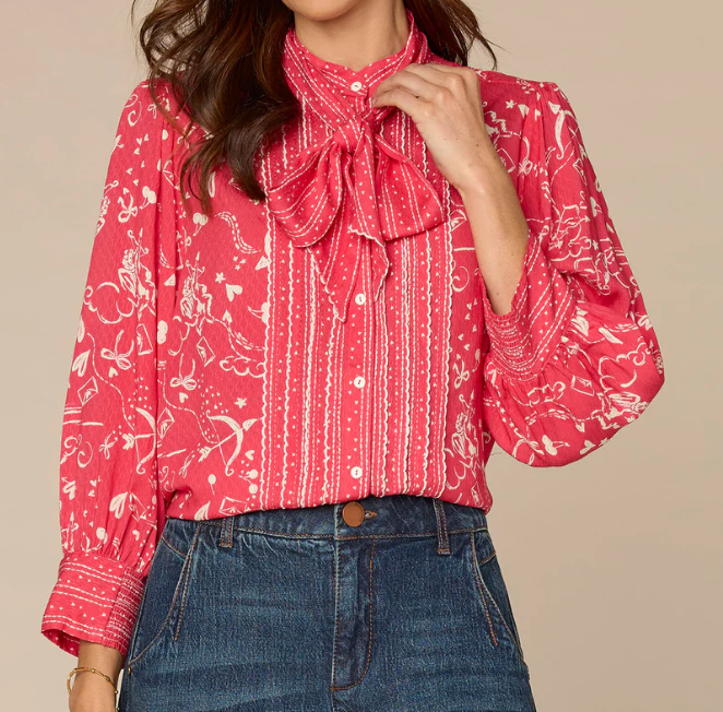 Woven 3/4 Sleeve Button Front Printed Blouse